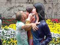 奇葩男狂吻路边女雕塑模特