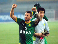 北京时间4月23日晚,2013亚冠联赛小组赛G组第5轮赛事展开,北京国安坐镇工体2-0战胜韩国浦项制铁队。国安在下一轮比赛只要打平广岛三箭,就可小组出线。图为马季奇庆祝胜利。中国网记者 寇莱昂 摄