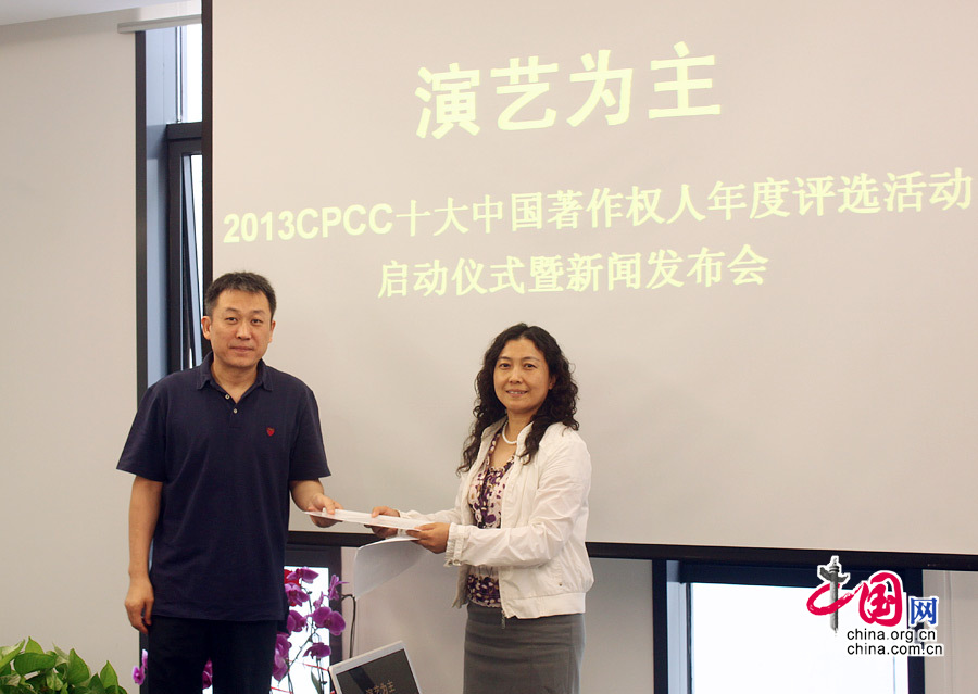 中国网9月12日讯(记者 刘颖颖)由中国版权保护中心主办的“2013 CPCC十大中国著作权人年度评选”活动于今日下午在天桥艺术大厦正式启动。本年度该项评选活动的主题是“演艺为主”,评选结果将在今年12月下旬公布,2014年2月举办颁奖典礼。