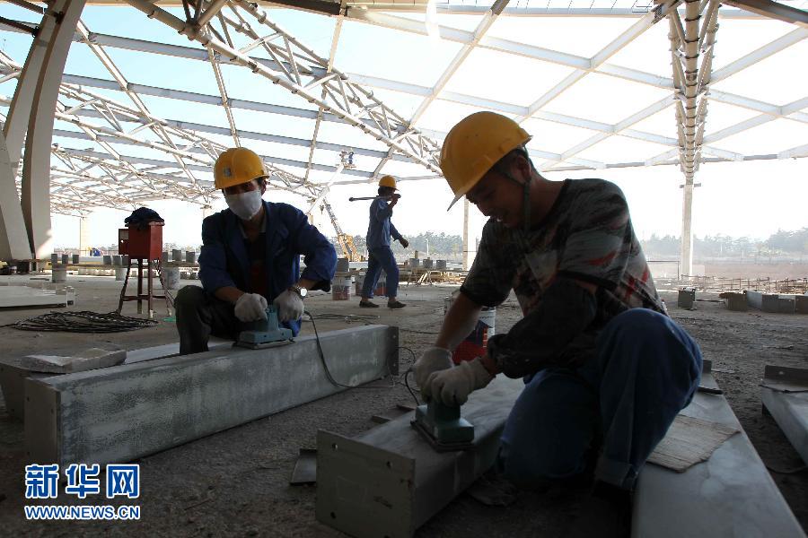 9月25日,中国工人在阿尔及利亚国家会议中心会议厅工地现场施工。由中国建筑股份有限公司(中建股份)阿尔及利亚分公司承建的阿尔及利亚国家会议中心项目位于阿尔及利亚首都阿尔及尔西郊,占地面积27万平方米,由会议厅、报告厅、展览厅、宴会厅、国家元首接待区以及配套建筑组成。项目预计2013年年末交工,建成后将成为阿尔及利亚举行重要会议和外事活动的场所。中建股份于1982年进驻阿尔及利亚市场,目前已成为当地最大的中国建筑企业。新华社发(穆罕默德·卡德里摄)