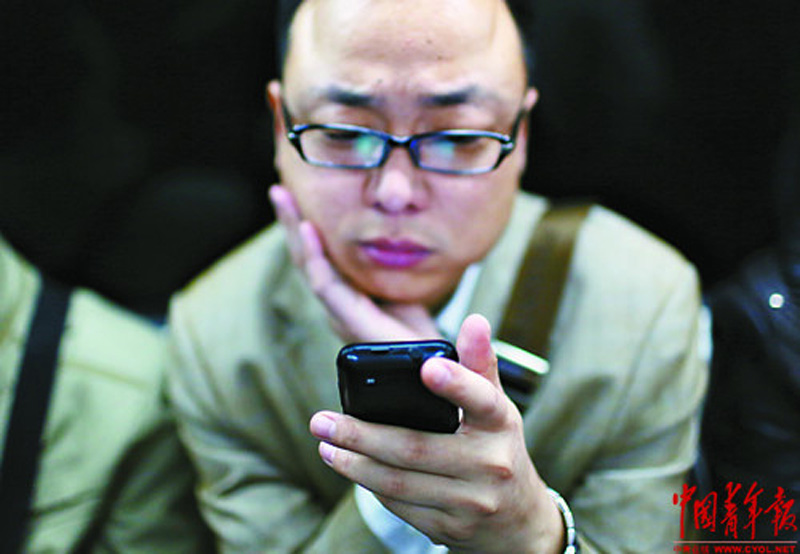 地铁上,一名上班族紧盯着手机屏幕。郑萍萍 摄图片来源:中国青年报