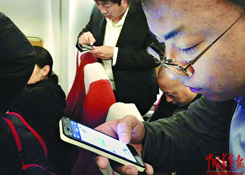 10月15日,北京飞往山西长治的一架航班刚刚落地,几位乘客迫不及待地打开手机。赵青 摄 图片来源:中国青年报