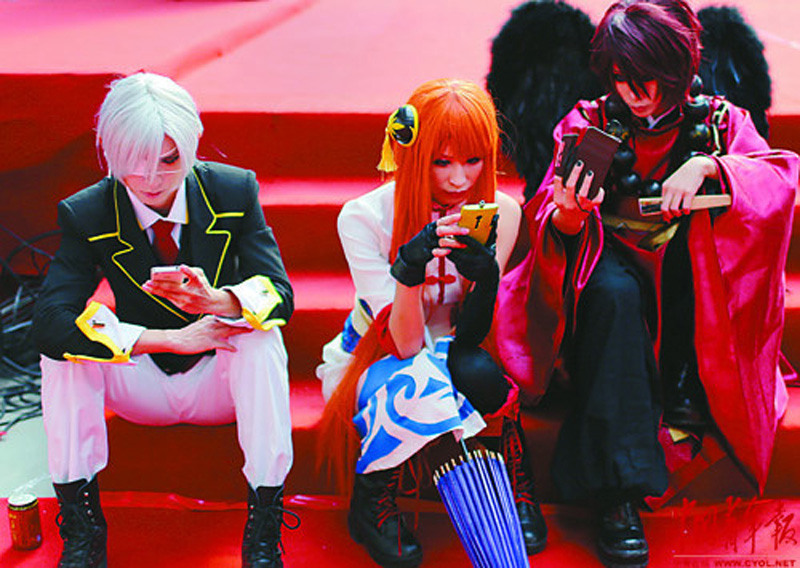 10月19日,北京国际动漫博览会上,参加COSPLAY表演的中外演员在台口“刷屏”等候上场。郑萍萍 摄 图片来源:中国青年报
