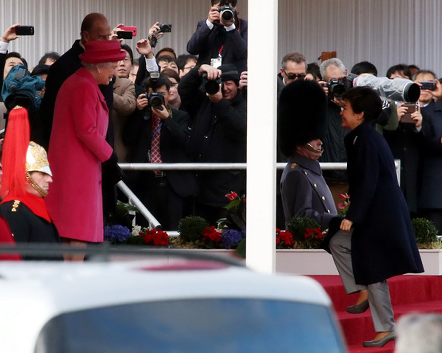 当地时间11月5日,唐宁街皇家骑兵卫队阅兵场,英国政府举行欢迎仪式,欢迎韩国总统朴槿惠到访。图片来源:韩国《中央日报》