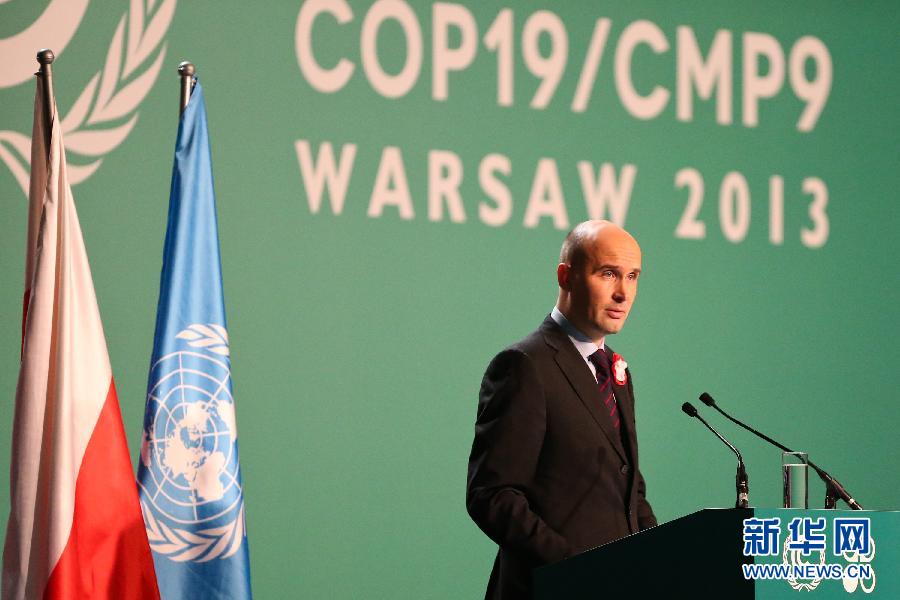 11月11日,在波兰华沙,2013年联合国气候变化大会主席、波兰环境部长马尔钦·科罗莱茨在开幕式上发言。 2013年联合国气候变化大会当日在波兰首都华沙开幕。 新华社记者张帆摄