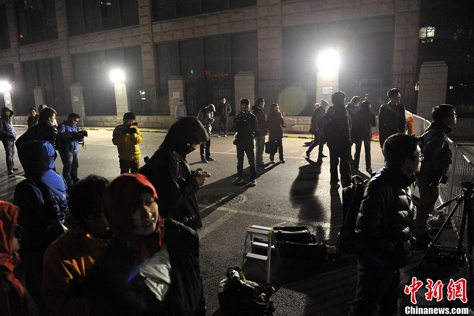 11月19日晚,李某某强奸案二审开庭。历经近13小时庭审,李某某乘坐的囚车在22点16分开离一中院,当日庭审结果尚未知。随后,李某律师张起淮也走出法庭,当被问及审讯结果,他只回复:“还好。”然后挥手致意上车离开。而据张起淮律师助理介绍,李家提供了很多新证据和对受害人口供质疑,控辩双方举证、质证很激烈。图为媒体记者在寒风中等待。中新网记者金硕 摄