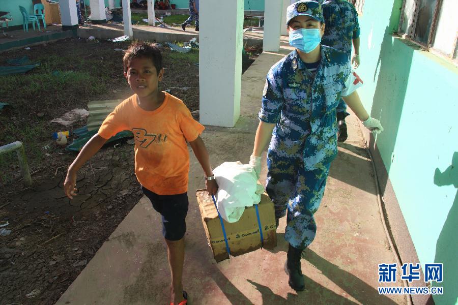 11月25日,在菲律宾塔克洛班,一名小志愿者协助海军和平方舟医院船海上医院医务人员开设前置医院。抵达菲灾区的中国海军和平方舟医院船25日在受灾最严重的塔克洛班市全面展开人道主义医疗救助行动。截至25日19时,作为此次人道主义医疗救援行动的主平台,和平方舟医院船海上医院已收治13名患者。从当日9时开始,22名和平方舟医院船海上医院医生携带医疗设备,在莱特省立医院旁搭建前置医院。与此同时,12名海上医院的医务人员分赴塔克洛班市东米沙鄢公立医院和罗慕尔德兹私立医院,与当地医务人员一起联合救治。新华社记者吴登峰摄
