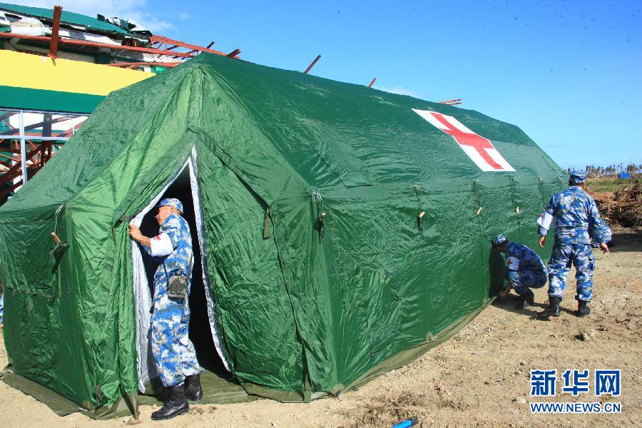 11月25日,在菲律宾塔克洛班,海上医院医务人员搭建前置医院的帐篷。抵达菲灾区的中国海军和平方舟医院船25日在受灾最严重的塔克洛班市全面展开人道主义医疗救助行动。截至25日19时,作为此次人道主义医疗救援行动的主平台,和平方舟医院船海上医院已收治13名患者。从当日9时开始,22名和平方舟医院船海上医院医生携带医疗设备,在莱特省立医院旁搭建前置医院。与此同时,12名海上医院的医务人员分赴塔克洛班市东米沙鄢公立医院和罗慕尔德兹私立医院,与当地医务人员一起联合救治。新华社记者吴登峰摄