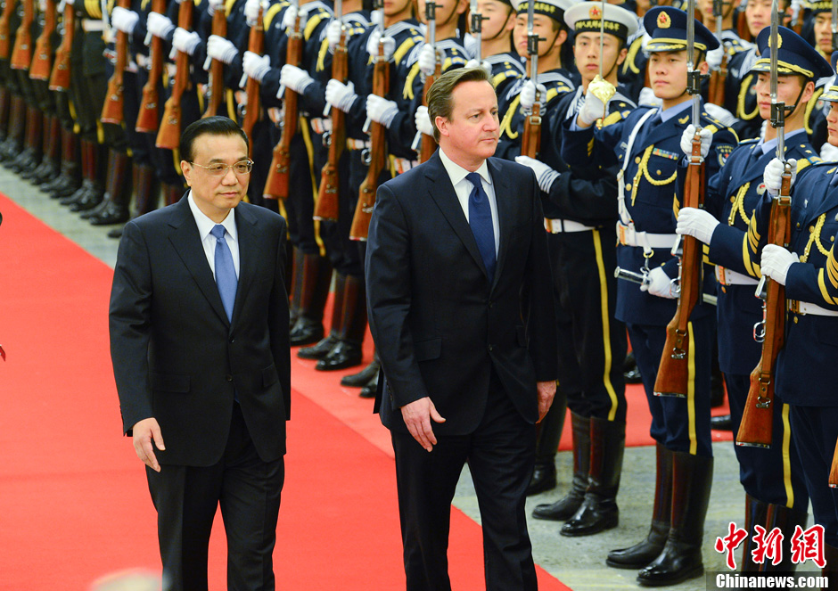 12月2日上午,中国国务院总理李克强在北京人民大会堂举行仪式欢迎英国首相卡梅伦访华。 中新社发 刘震 摄
