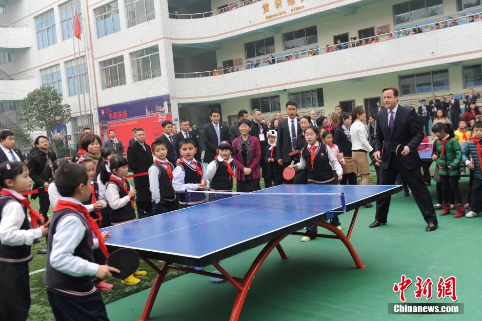 英国首相卡梅伦访问四川 与成都小学生切磋乒乓球技[组图]