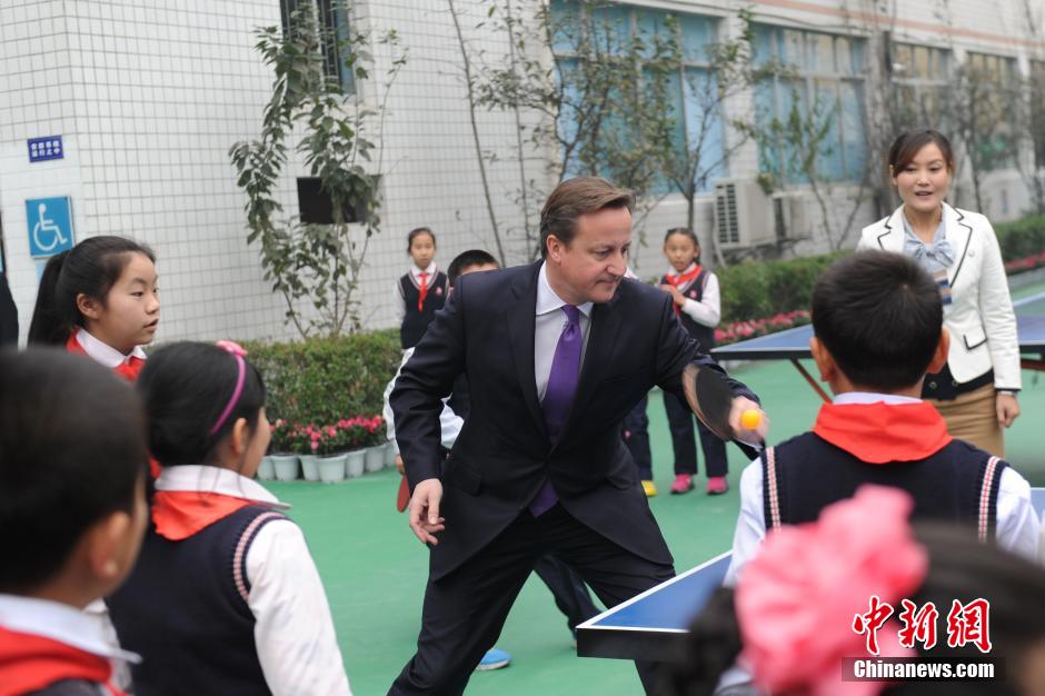 英国首相卡梅伦访问四川 与成都小学生切磋乒乓球技[组图]