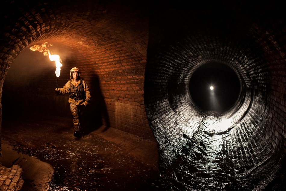 在俄罗斯被称为“挖掘者”的地下探险运动创始人Vadim Mikhailov正在查看涅格林纳亚河地下隧道,这些隧道就建在历史悠久的莫斯科市中心的地下。