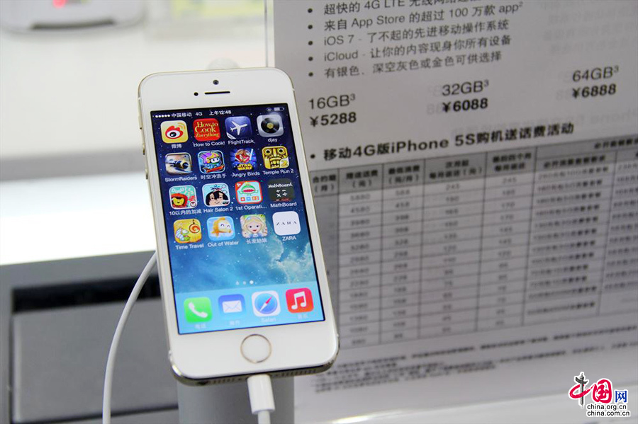 1月17日,在南京新街口万达移动营业厅拍摄的移动4G版iPhone 5s样机。中国网图片库 王胜涛 摄