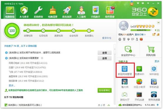 “家庭网络管理”是360安全卫士在2013年推出的功能,也是国内首个路由器管理工具,目前已经支持90%以上的路由器型号。它的使用方法也非常简单,几步操作就可以搞定: