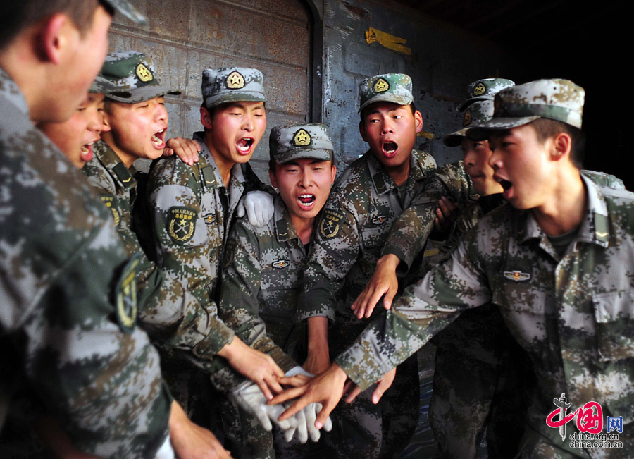 搬运物资的战士们苦中作乐,高喊口号打气鼓劲。