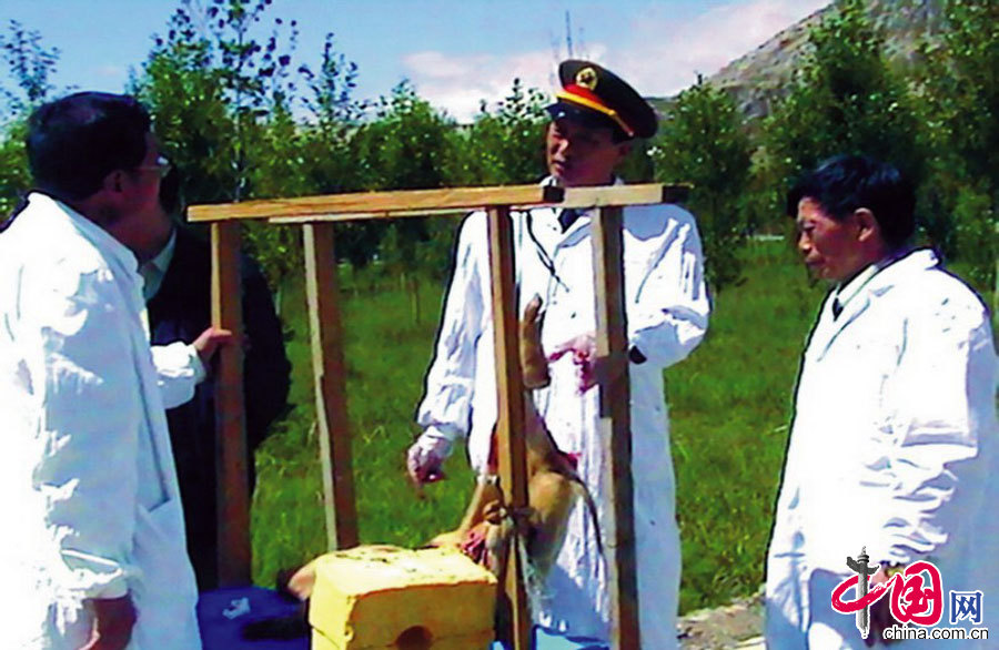拉萨高原火器伤现场实验,王正国(右2)与杨志焕教授(右1)(2003年)
