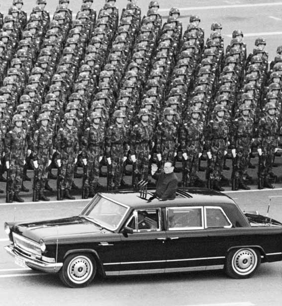 10月1日,首都各界群众庆祝中华人民共和国成立50周年大会在北京天安门广场隆重举行。这是中共中央总书记、国家主席、中央军委主席江泽民在检阅受阅部队。本报记者 周朝荣摄
