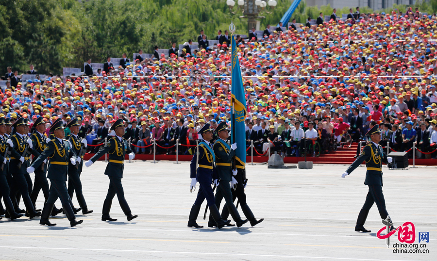 9月3日,中国人民抗日战争暨世界反法西斯战争胜利70周年纪念大会在北京隆重举行,有11个国家派方队、6个国家派代表队来华参加阅兵。图为哈萨克斯坦武装力量方队通过天安门广场。中国网记者 杨佳摄影