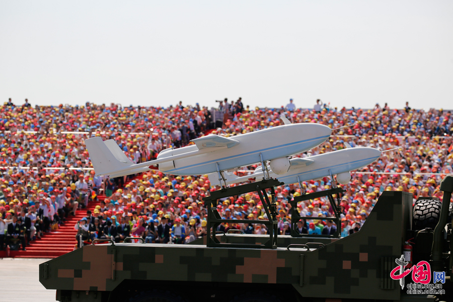 9月3日,中国人民抗日战争暨世界反法西斯战争胜利70周年纪念大会在北京隆重举行。无人机方队通过天安门广场接受检阅。中国网杨佳摄影