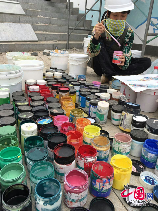这是我第一次参与绘制大型的壁画,从纸本的架上绘画一下子跨越到公共空间的大型创作,起稿、测量、打格、放大,一系列流程都走了一遍,心里更加澄明自信。对于绘制程序的安排和把握也总结出很多经验:如何套版,颜色由浅到深如何层层叠压,色面之间均匀与不均匀的对比关系……这都与岩彩画的创作有很大关联,给予我很多启发。每天行走在村落的小巷中,两旁的建筑都有着各自的色彩基调,似乎色彩有一种魅力,它们可以包容一切喧闹,带给人一种安静的祥和。最开心的是听到工人朋友的招呼和村民们的夸赞,他们真诚的词语,让我感受到被认可和被接纳的内心欢喜。 ——金璐