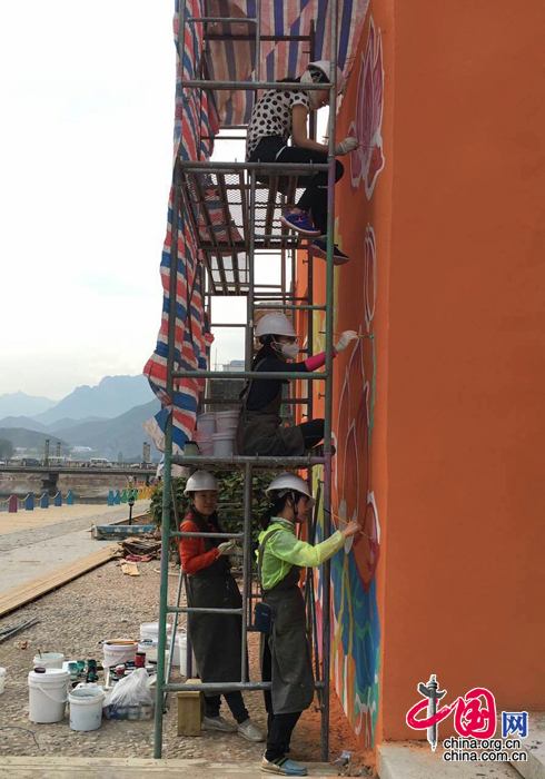 2016年2月至9月,中央美術學院胡明哲教授接受了中国建筑集团城乡与风景园林规划设计研究院的邀请,率领中央美术学院中国岩彩画创作高研班团队,参与了河北省美丽乡村建设和旅游发展改造项目。图为现场。