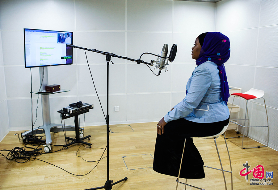 在位于北京亦庄的一间录音棚里,电视播放着中国观众熟悉的国产电视剧《嘿!老头》片段。屏幕上一名女性角色正在说着什么,但传出的声音却是陌生的斯瓦西里语。让角色重新“发声”的,是非洲女孩Rukia Hamdan。中国网记者 伦晓璇 摄