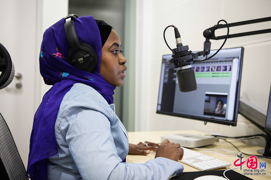 在对白棚里,Rukia Hamdan一边配音,一边自己操作软件。初来乍到时,Rukia对专业的器材和软件操作还不熟练。每当这时,Rukia身边的中国同事会毫不犹豫地帮助她,好学的Rukia也会主动向同事们请教在技术、语言、文化中遇到的一些问题。中国网记者 伦晓璇 摄
