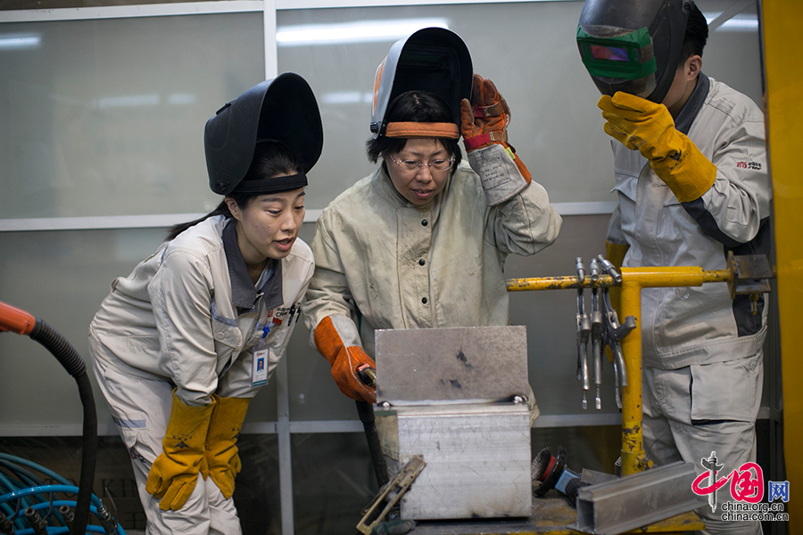 全国五一劳动奖章获得者、焊接技能专家孙景南在教徒弟们焊接技术。 中国网记者 董宁摄影中国网讯(记者 董宁) 5月24日,“我与工匠走一线——全国重点主流媒体走进身边大国工匠采访团”来到中车南京浦镇车辆有限公司,探访全国五一劳动奖章获得者、焊接技能专家孙景南。