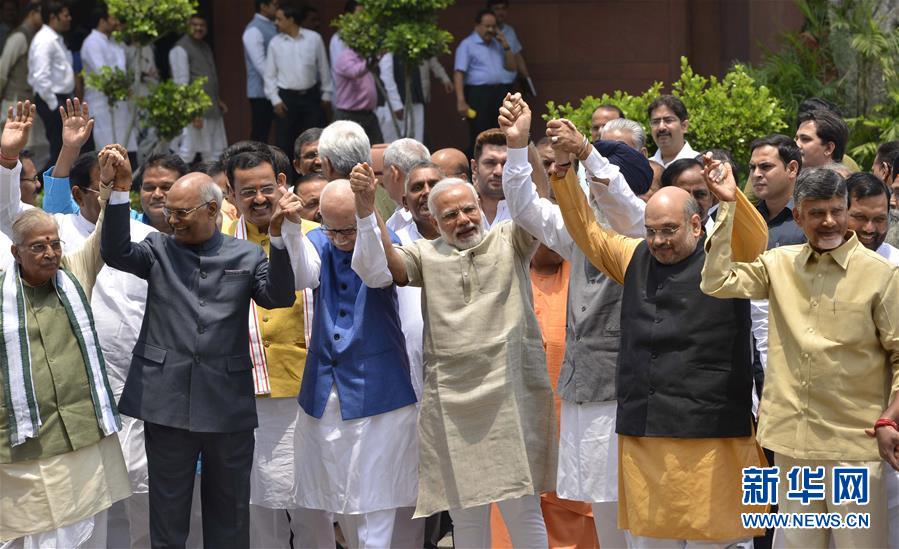 这张6月23日在印度新德里拍摄的资料照片显示,拉姆·纳特·考文德(前排左二)与印度总理莫迪(前中)等人合影。 新华社发