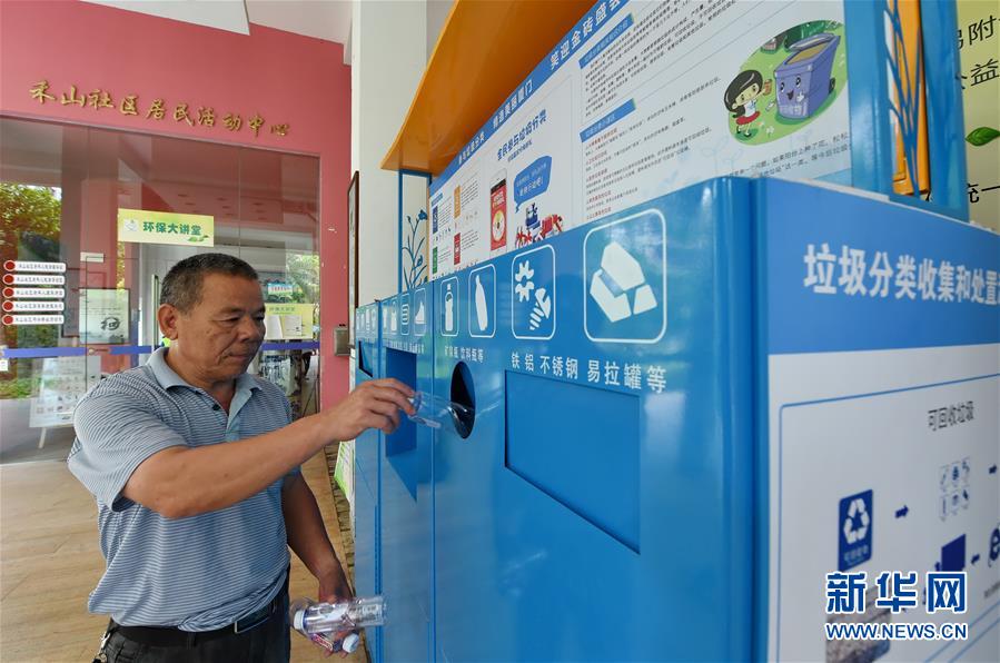 在垃圾分类示范点厦门市湖里区禾山街道禾山社区,住户康清木将矿泉水瓶放入“可回收物回收箱”里(6月2日摄)。
