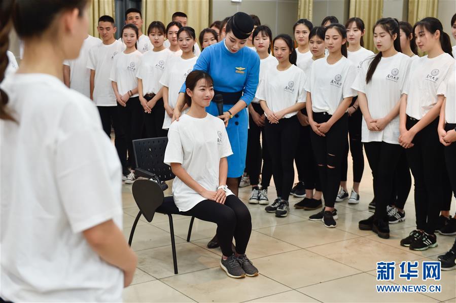 厦航空姐对厦门大学志愿者进行礼仪培训(5月10日摄)。