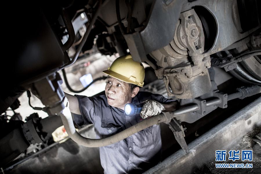 7月30日,在武汉武昌客运机车整备场检修库房,51岁的电力机车钳工吴卫兵在机车底部进行检查维护。当日,武汉武昌客运机车整备场上热浪滚滚,十多名机车检修人员在蒸笼般的库房内,对每台机车的车顶、机械室和车底进行检查作业。这是武汉铁路局武昌南机务段武昌整备车间职工工作场景,他们主要负责武昌火车站到达的客运机车入库后的全方位检查和保养,确保每台机车“健康”上线。入伏以来,武汉地区持续高温,检修库房温度普遍要比室外温度高出近10℃,又值暑运,这个车间的整备任务非常重。修完一辆,送走一辆,又来一辆,他们刚把身上的汗水晾干,又继续下一辆机车的整备作业。新华社记者肖艺九摄