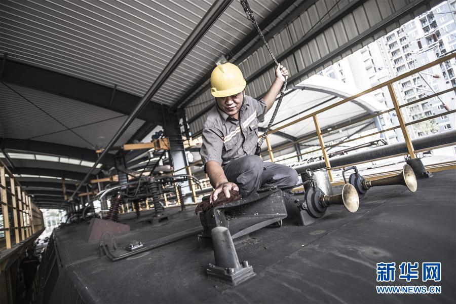 7月30日,在武汉武昌客运机车整备场检修库房,55岁的电力机车钳工陈才运对机车顶部设备进行检查维护。当日,武汉武昌客运机车整备场上热浪滚滚,十多名机车检修人员在蒸笼般的库房内,对每台机车的车顶、机械室和车底进行检查作业。这是武汉铁路局武昌南机务段武昌整备车间职工工作场景,他们主要负责武昌火车站到达的客运机车入库后的全方位检查和保养,确保每台机车“健康”上线。入伏以来,武汉地区持续高温,检修库房温度普遍要比室外温度高出近10℃,又值暑运,这个车间的整备任务非常重。修完一辆,送走一辆,又来一辆,他们刚把身上的汗水晾干,又继续下一辆机车的整备作业。新华社记者肖艺九摄
