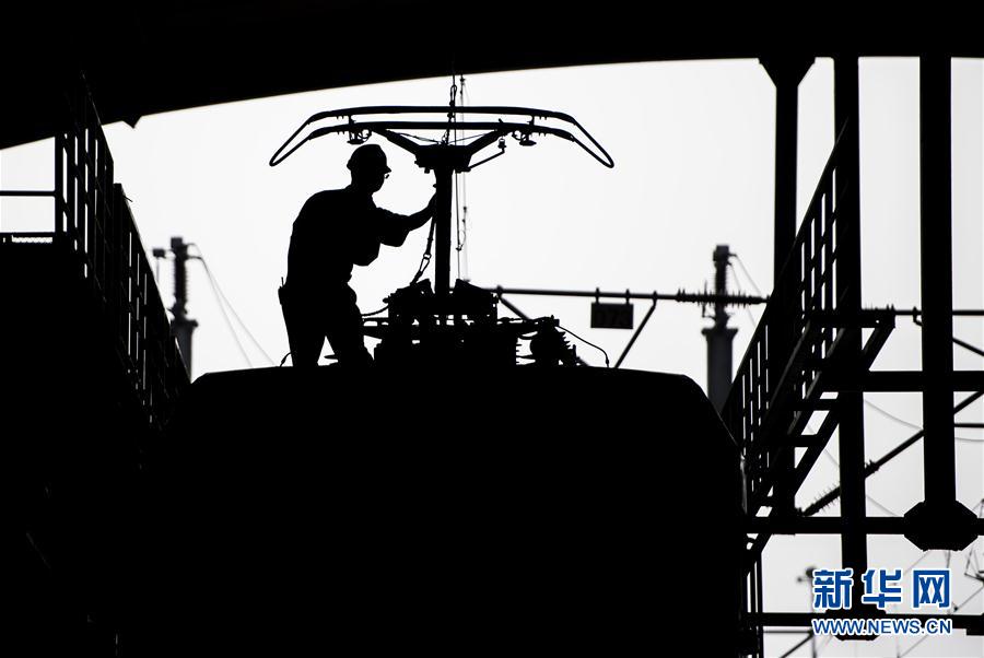 7月30日,在武汉武昌客运机车整备场检修库房,46岁的电力机车电工粟宇对车顶受电弓进行检查维护。当日,武汉武昌客运机车整备场上热浪滚滚,十多名机车检修人员在蒸笼般的库房内,对每台机车的车顶、机械室和车底进行检查作业。这是武汉铁路局武昌南机务段武昌整备车间职工工作场景,他们主要负责武昌火车站到达的客运机车入库后的全方位检查和保养,确保每台机车“健康”上线。入伏以来,武汉地区持续高温,检修库房温度普遍要比室外温度高出近10℃,又值暑运,这个车间的整备任务非常重。修完一辆,送走一辆,又来一辆,他们刚把身上的汗水晾干,又继续下一辆机车的整备作业。新华社记者肖艺九摄