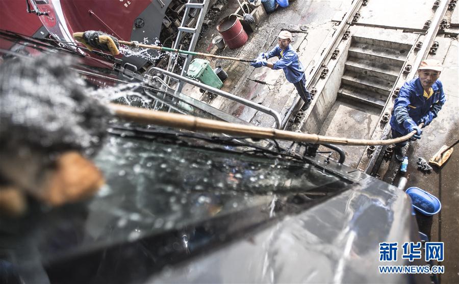 7月30日,在武汉武昌客运机车整备场检修库房,机车清洁工对机车进行外部清洗。当日,武汉武昌客运机车整备场上热浪滚滚,十多名机车检修人员在蒸笼般的库房内,对每台机车的车顶、机械室和车底进行检查作业。这是武汉铁路局武昌南机务段武昌整备车间职工工作场景,他们主要负责武昌火车站到达的客运机车入库后的全方位检查和保养,确保每台机车“健康”上线。入伏以来,武汉地区持续高温,检修库房温度普遍要比室外温度高出近10℃,又值暑运,这个车间的整备任务非常重。修完一辆,送走一辆,又来一辆,他们刚把身上的汗水晾干,又继续下一辆机车的整备作业。新华社记者肖艺九摄