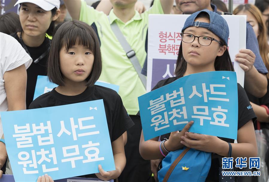 7月31日,在韩国首尔国防部门前,韩国民众高举反对部署“萨德”系统的标语参加抗议集会。