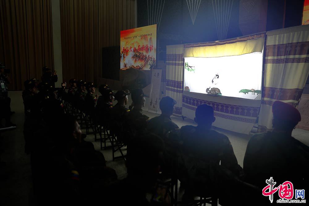 8月1日,在参加“国际军事比赛-2017”空降排比赛的各国参赛队来到“友谊之家”文化展示中心,参观了中国传统文化展。委内瑞拉参赛队队员被皮影戏《龟与鹤》所吸引。中国网杨佳摄影