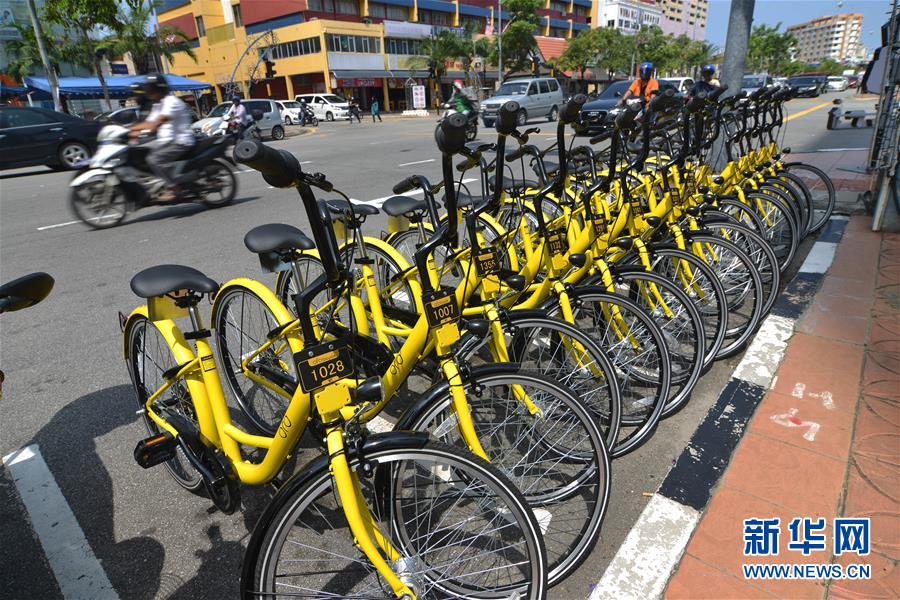 这是8月3日在马来西亚马六甲街边拍摄的共享单车。中国共享单车品牌ofo小黄车3日在马来西亚古城马六甲举行推介活动,宣布首批500辆ofo小黄车正式进驻马来西亚。新华社发(张纹综 摄)