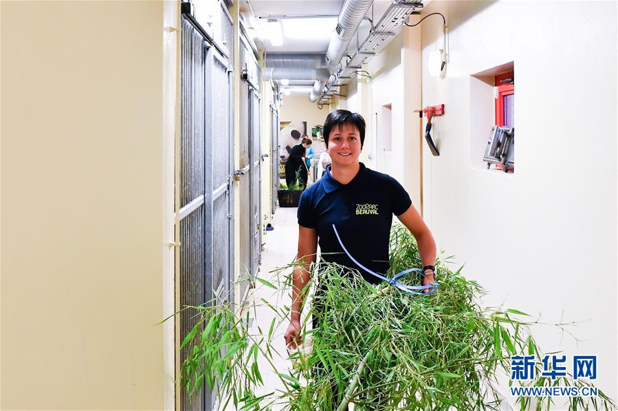 8月4日,在法国圣艾尼昂博瓦勒野生动物园,饲养员走出大熊猫“欢欢”待产笼舍。