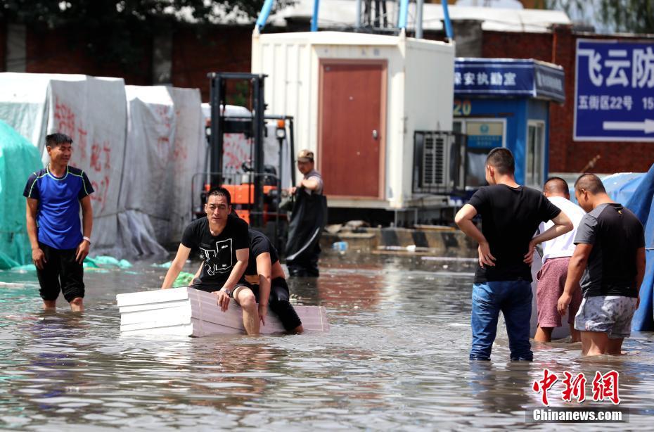 哈尔滨暴雨后多地内涝 市民划自制“竹筏”抢救财物[组图]