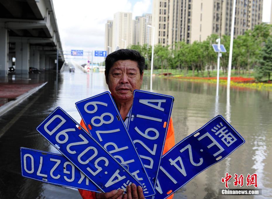 图为抢排人员在水中拾取的车牌。中新社记者 王舒 摄