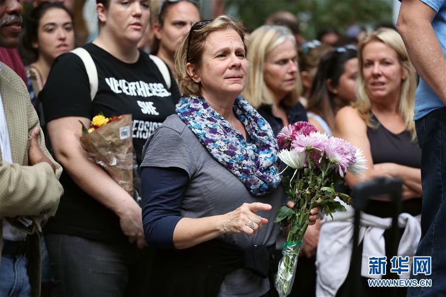 8月13日,在美国芝加哥,一名女子手持鲜花参加纪念活动。数百名芝加哥市民13日聚集在市中心的联邦广场,为夏洛茨维尔市暴力事件受害者举行纪念活动。美国弗吉尼亚州夏洛茨维尔市12日在大规模集会期间发生暴力事件,导致3人死亡、30多人受伤。新华社记者汪平摄