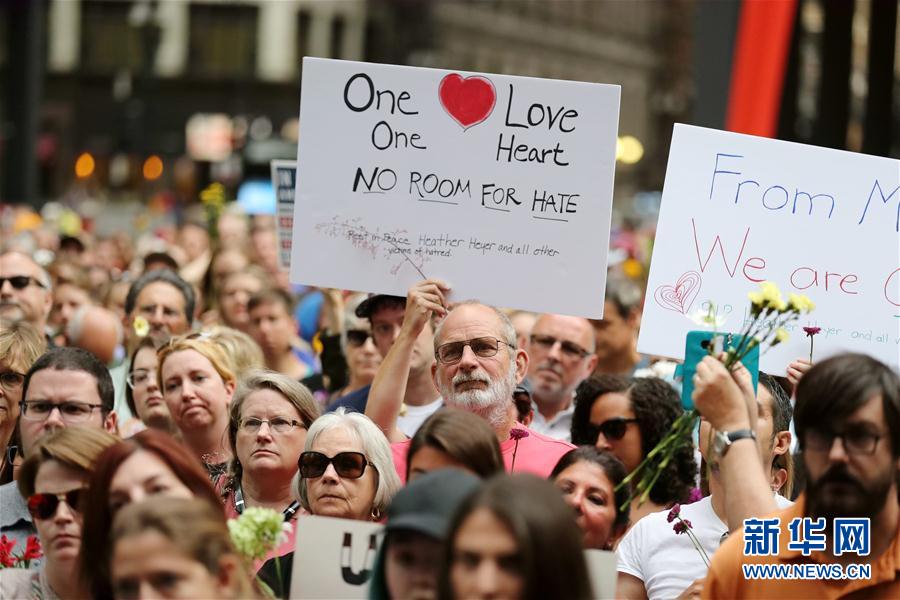 8月13日,在美国芝加哥,一名男子手持标语参加纪念活动。数百名芝加哥市民13日聚集在市中心的联邦广场,为夏洛茨维尔市暴力事件受害者举行纪念活动。美国弗吉尼亚州夏洛茨维尔市12日在大规模集会期间发生暴力事件,导致3人死亡、30多人受伤。新华社记者汪平摄