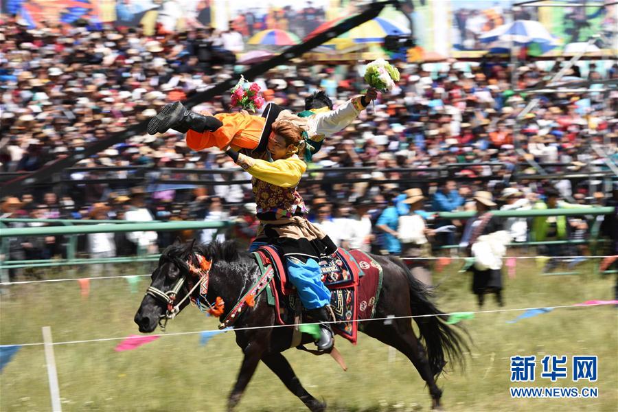 8月13日,骑手在赛马节开幕上表演马术。当日,九色甘南香巴拉·玛曲第十一届格萨尔赛马节在甘肃玛曲开幕。