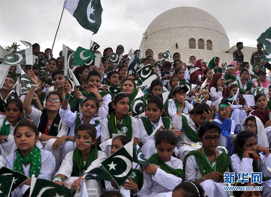 8月14日,在巴基斯坦南部城市卡拉奇,当地学生参加巴基斯坦独立70周年纪念活动。新华社发(马斯鲁尔摄)