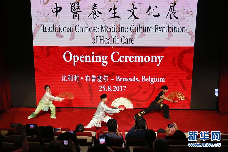 8月25日,在比利时首都布鲁塞尔的中国文化中心,上海中医药大学学生在台上表演。当日,由布鲁塞尔中国文化中心和上海中医药大学联合举办的中医养生文化展开幕,通过展览、表演、讲座及各种活动,向来宾展示博大精深的中华医药文化。新华社记者叶平凡摄
