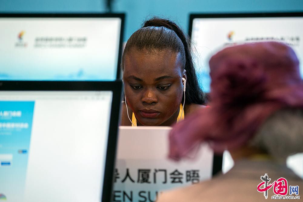 9月3日,各国媒体在新闻中心实时报道金砖国家工商论坛开幕式。陈建摄影