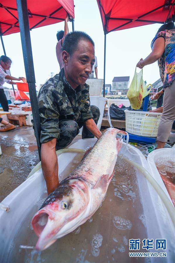 9月9日,在长兴县太湖街道新塘村的港湾里,渔民在集市上售卖刚捕捞回来的大鱼。