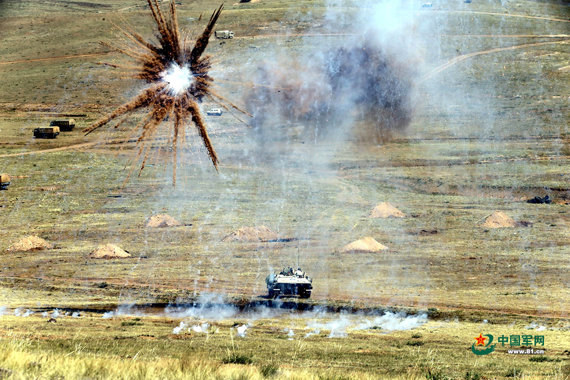 蓝军的发烟车风驰电掣般从阵地前横穿,随之,烟幕弥漫阵地。紧接着,蓝军坦克分别从左右两侧撕开口子,两路并进,对红军正面防御阵地形成包围圈。红军阵地上的士兵不甘示弱,沉着应战,一辆辆“敌”坦克接连被击中,“突突”冒着黑烟。此时,红军正面防御主力,迅速向中心战场回援,对蓝军步战车进行切割和反包围……