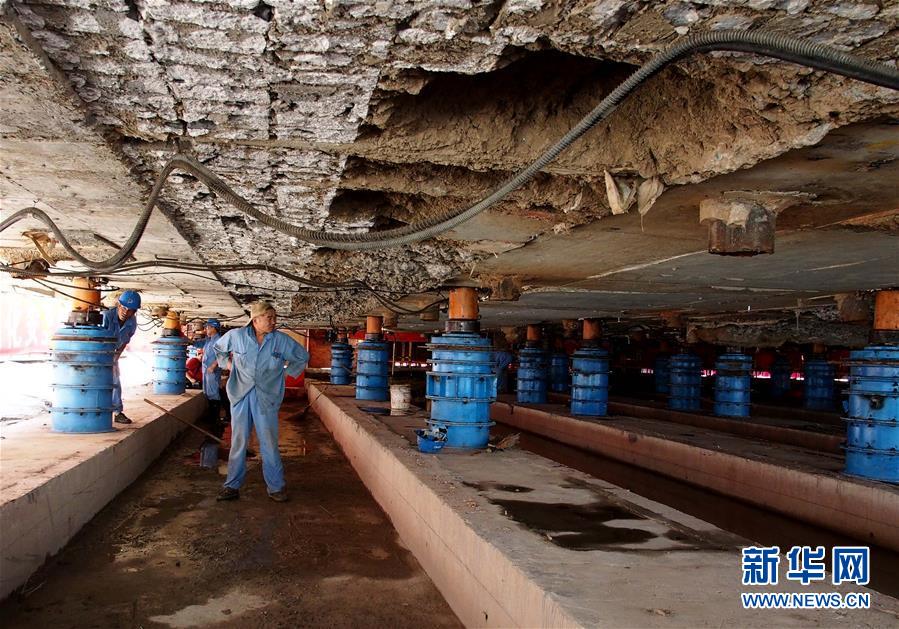9月17日,施工人员完成大雄宝殿最后10毫米的顶升施工。新华社记者 任珑 摄